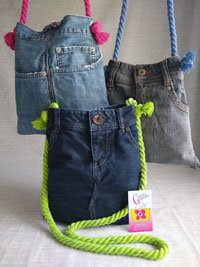 BlueJean Cuties: simple and upcycled from blue jeans, these adorable bags look like denim mini skirts highlighted by a fun twisted rope strap